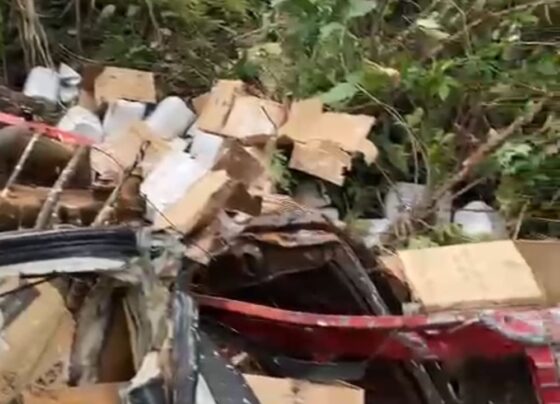 Galões, caixas e sacos com os defensivos caíram a poucos metros do rio na hora do acidente – Foto: reprodução…