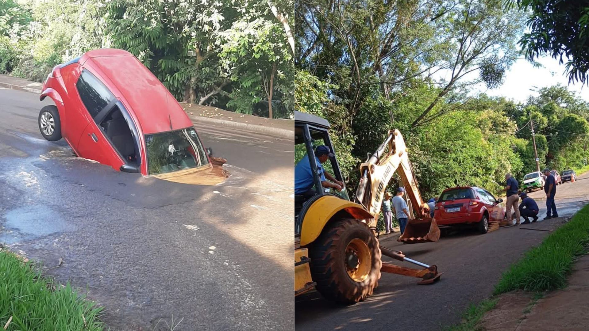 O órgão municipal afirmou que as vítimas conseguiram sair rapidamente do local e ninguém se feriu. Posteriormente, o buraco aumentou e o carro afundou ainda mais.