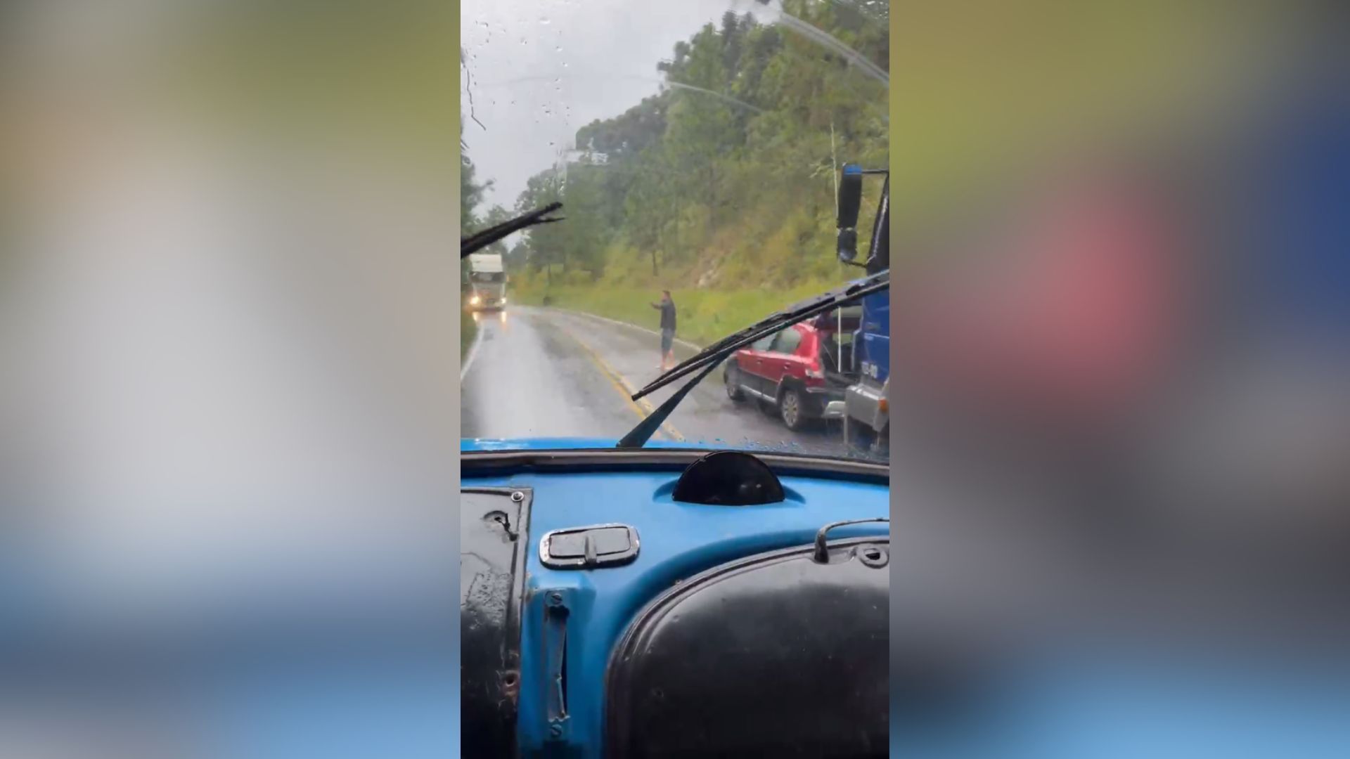Em seguida, um homem que está de costas aparece. A imagem mostra que ele está fazendo sinal para outro caminhão, que vem no sentido contrário.